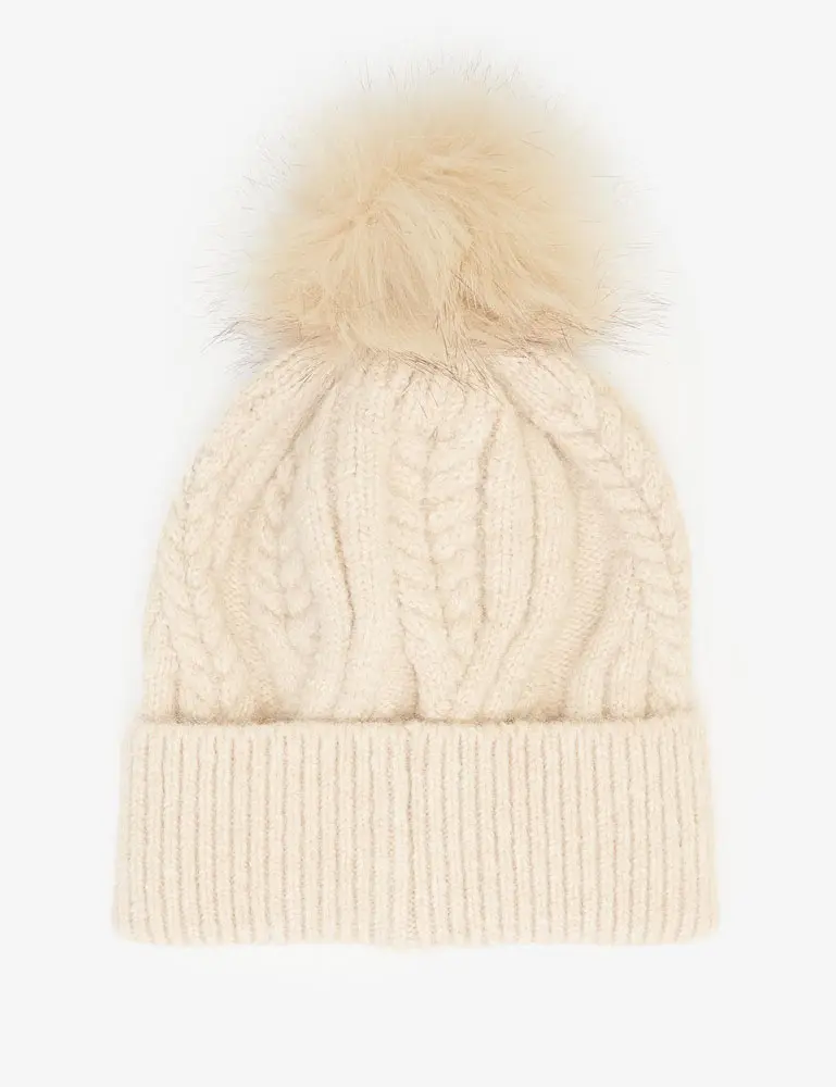 A winter essential from the Barbour womens collection.  Crafted in a chunky cable knit with a turnback hem to provide ultimate warmth. The Barbour logo patch branding and the faux fur pom-pom add the finishing touches.
