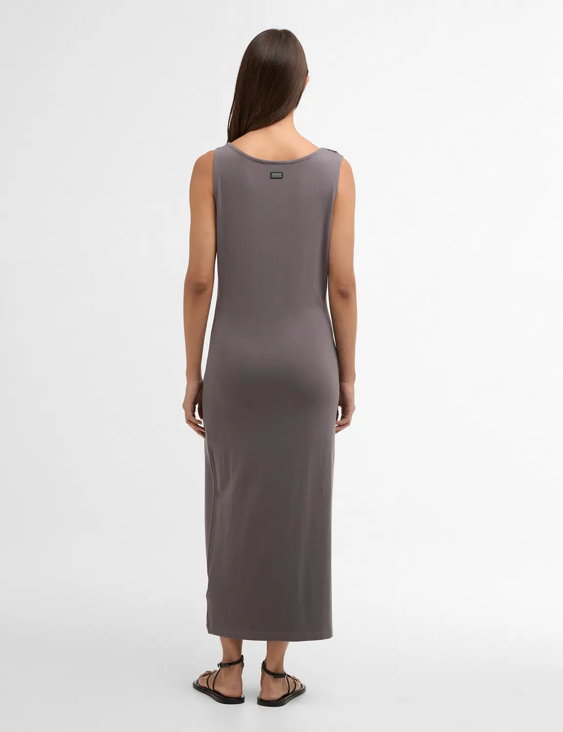 The Barbour Intl GIGI Midi Dress. This sleek and stylish jersey dress is crafted in a soft and stretchy fabric for a comfortable wear and is complemented with a decorative buckle at the shoulder.