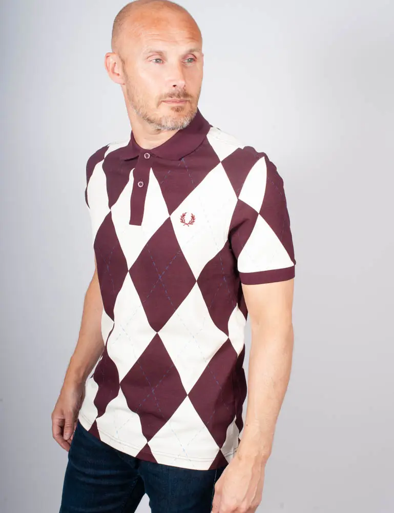 A visually striking polo shirt from Fred Perry  Crafted in rich cotton pique, this polo shirt features an all-over Argyle print, a gently ribbed collar and the signature embroidered laurel wreath at the chest.