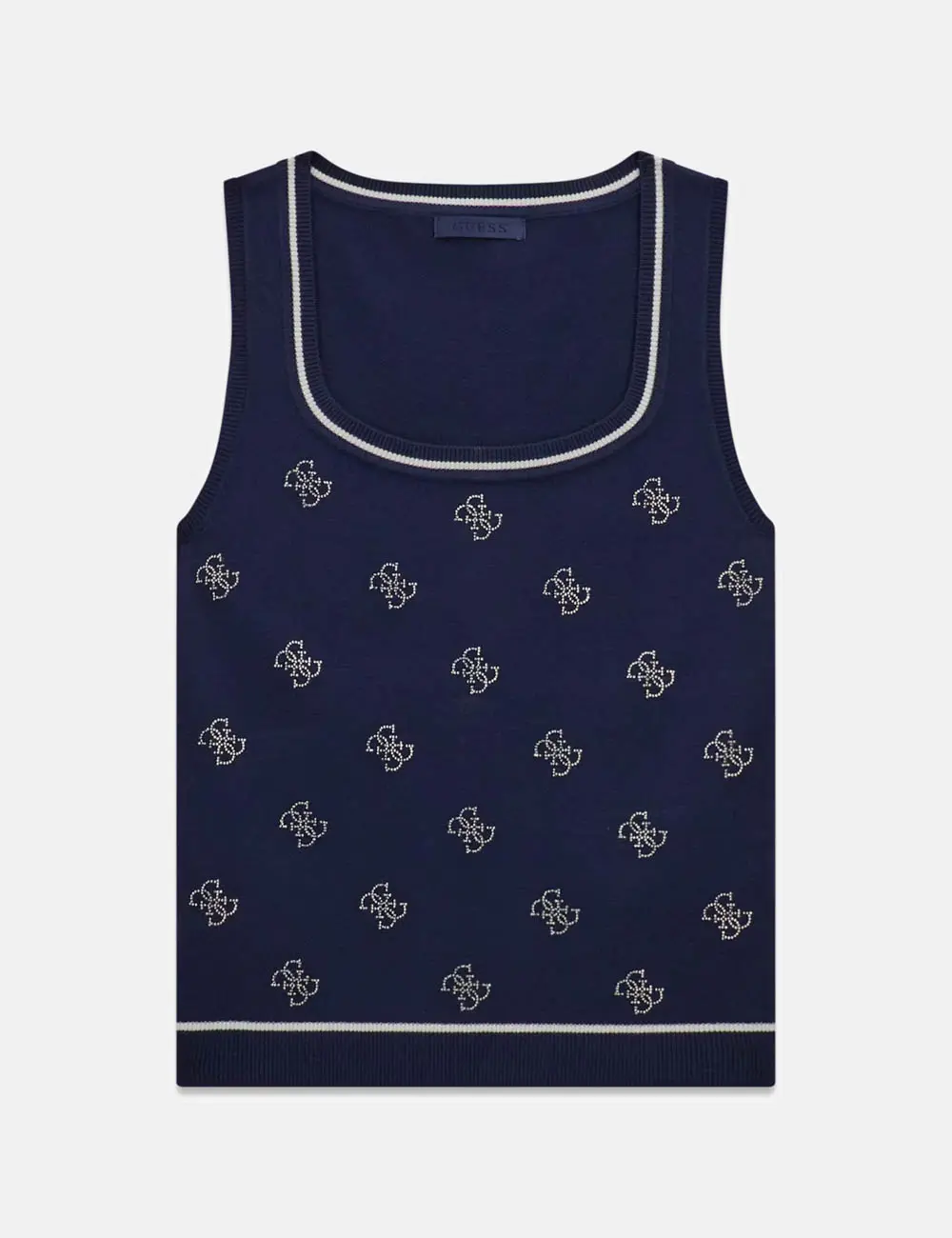 Add a touch of glitz to your Summer wardrobe with this knitted top from Guess. Crafted in a soft fabric that has ribbed trims with contrast thread and adorned with a repeat all-over 4G rhinstone logo.
