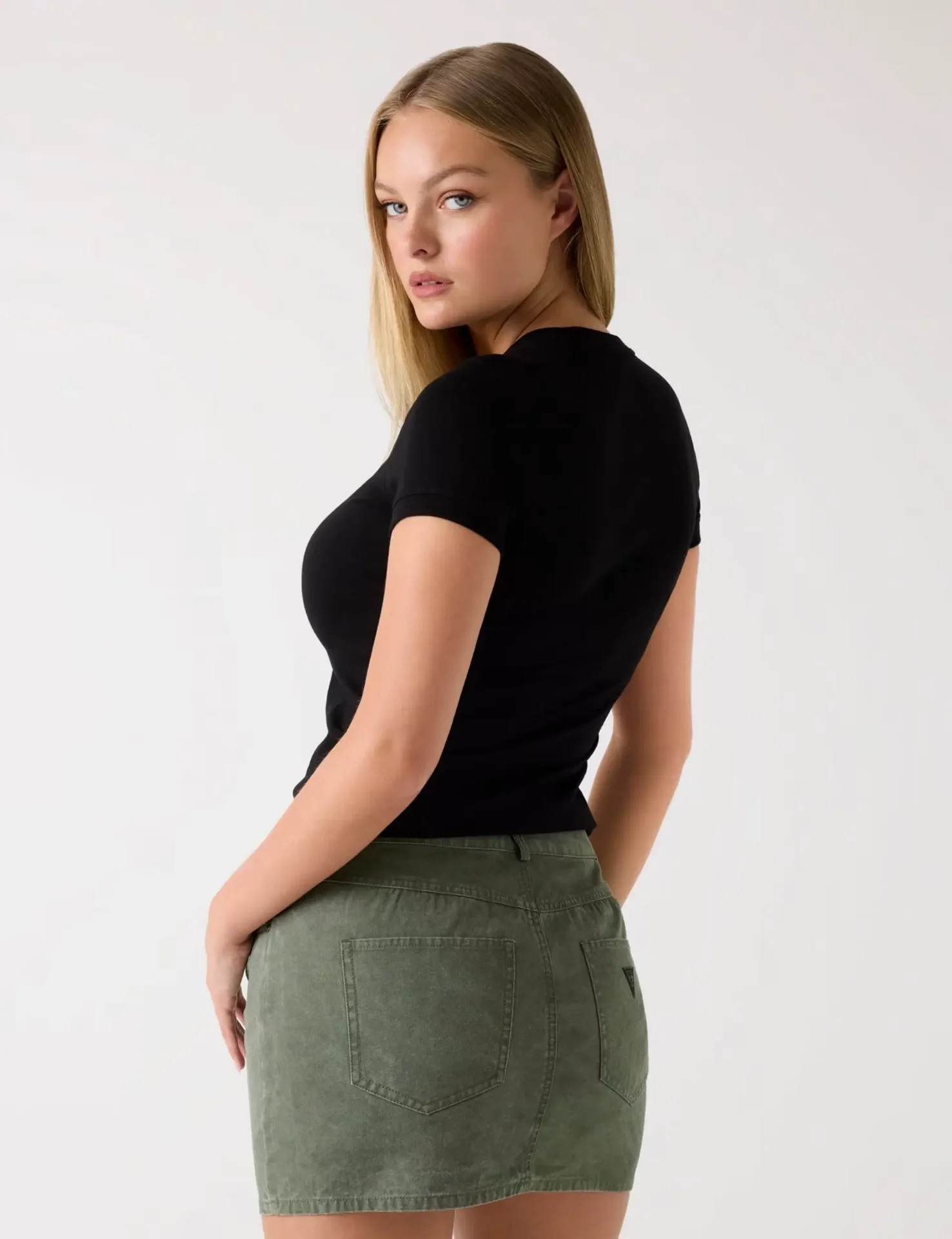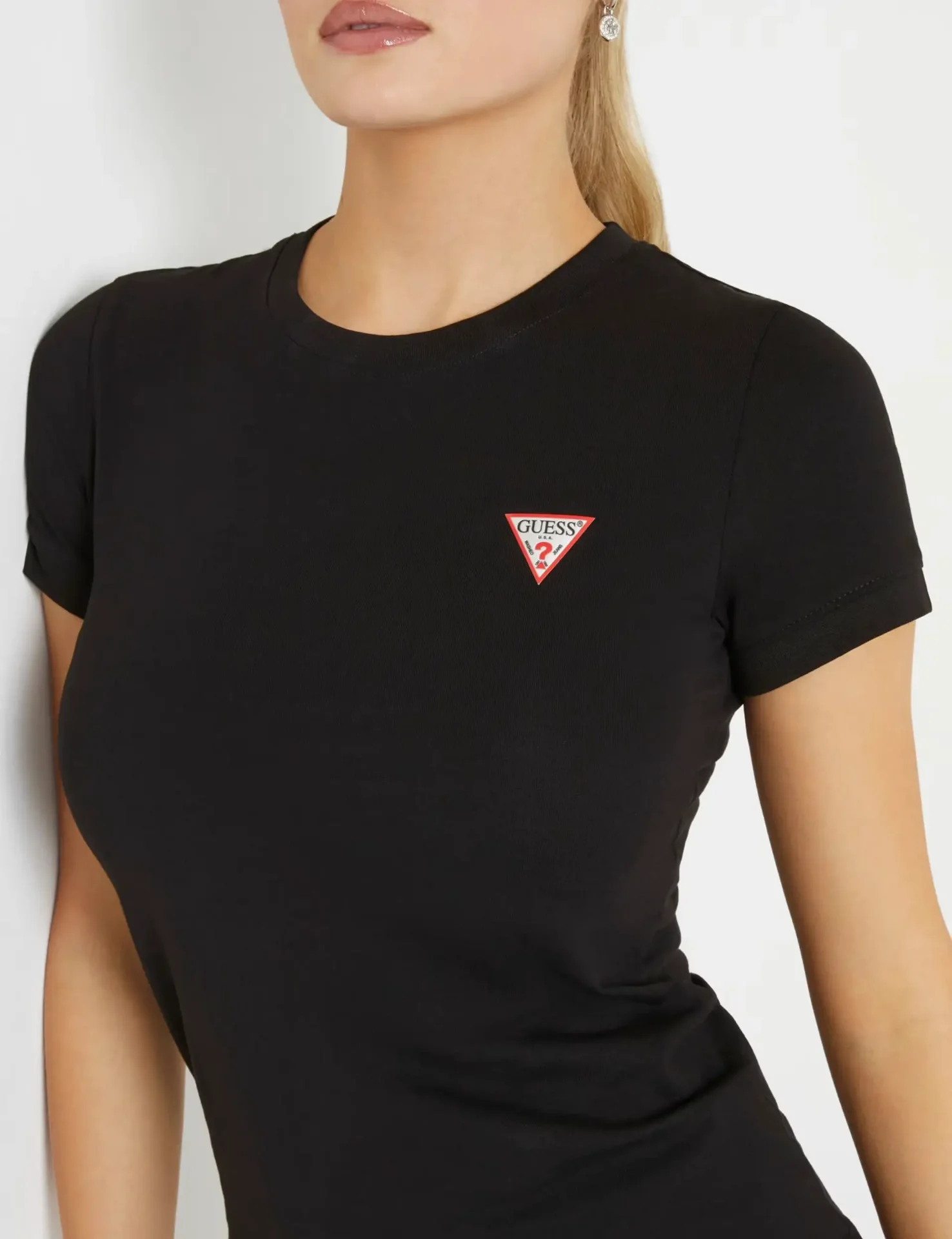 The Guess Triangle Logo Stretch T-Shirt delivers a perfect blend of comfort and signature style. Crafted from soft, stretchy cotton jersey, it offers a flattering fit that moves with you. The iconic Guess triangle logo adorns the chest, adding a bold yet timeless statement.
