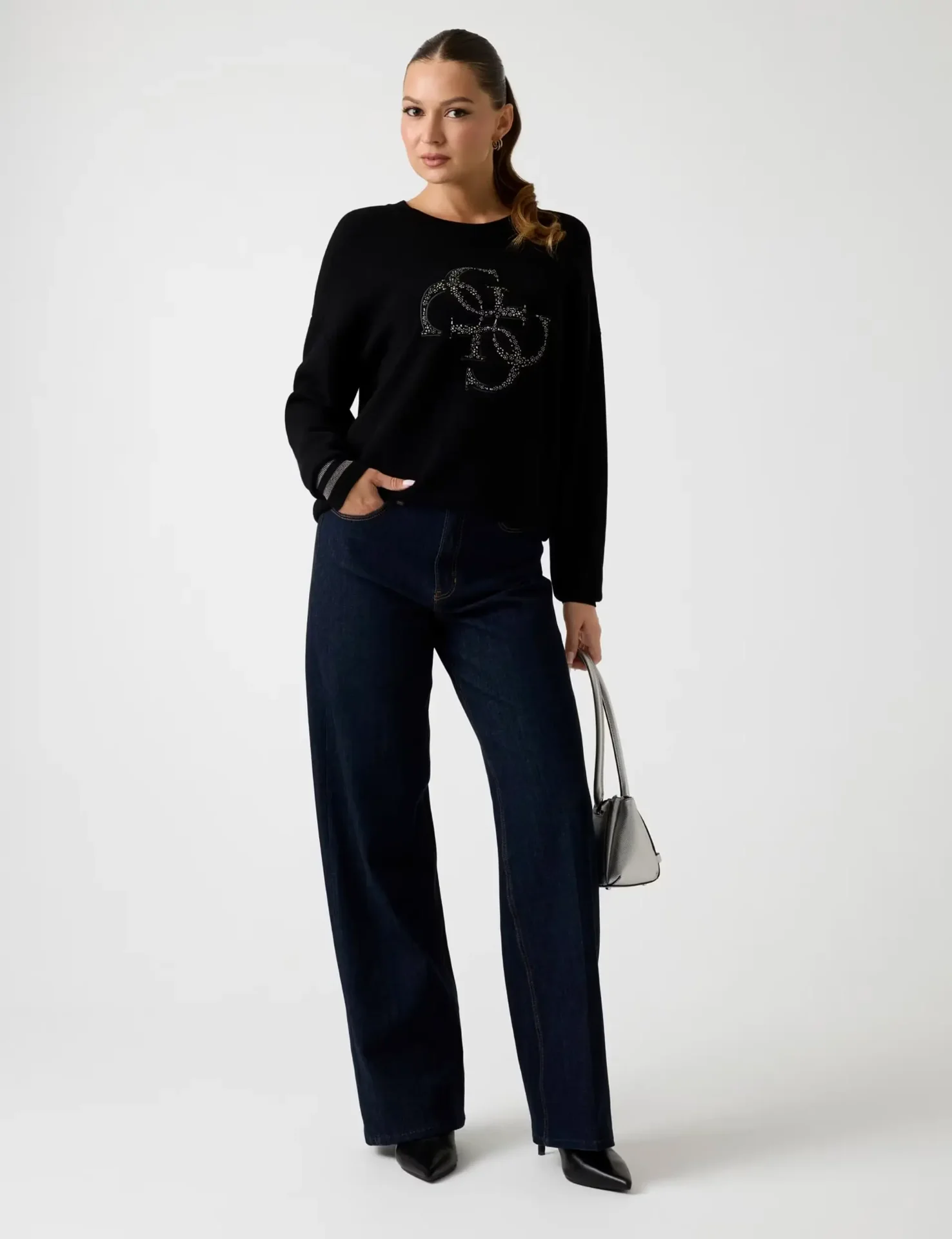 The Guess Studded Logo Sweater brings a refined edge to casual dressing. Crafted from a soft stretch viscose-blend fabric, it offers a flattering fit with a classic crew neckline and elegant balloon sleeves. The rib-knit trims add structure, while striped cuffs and a studded 4G logo on the front deliver signature Guess flair. Perfect for adding a touch of glamour to your everyday wardrobe.