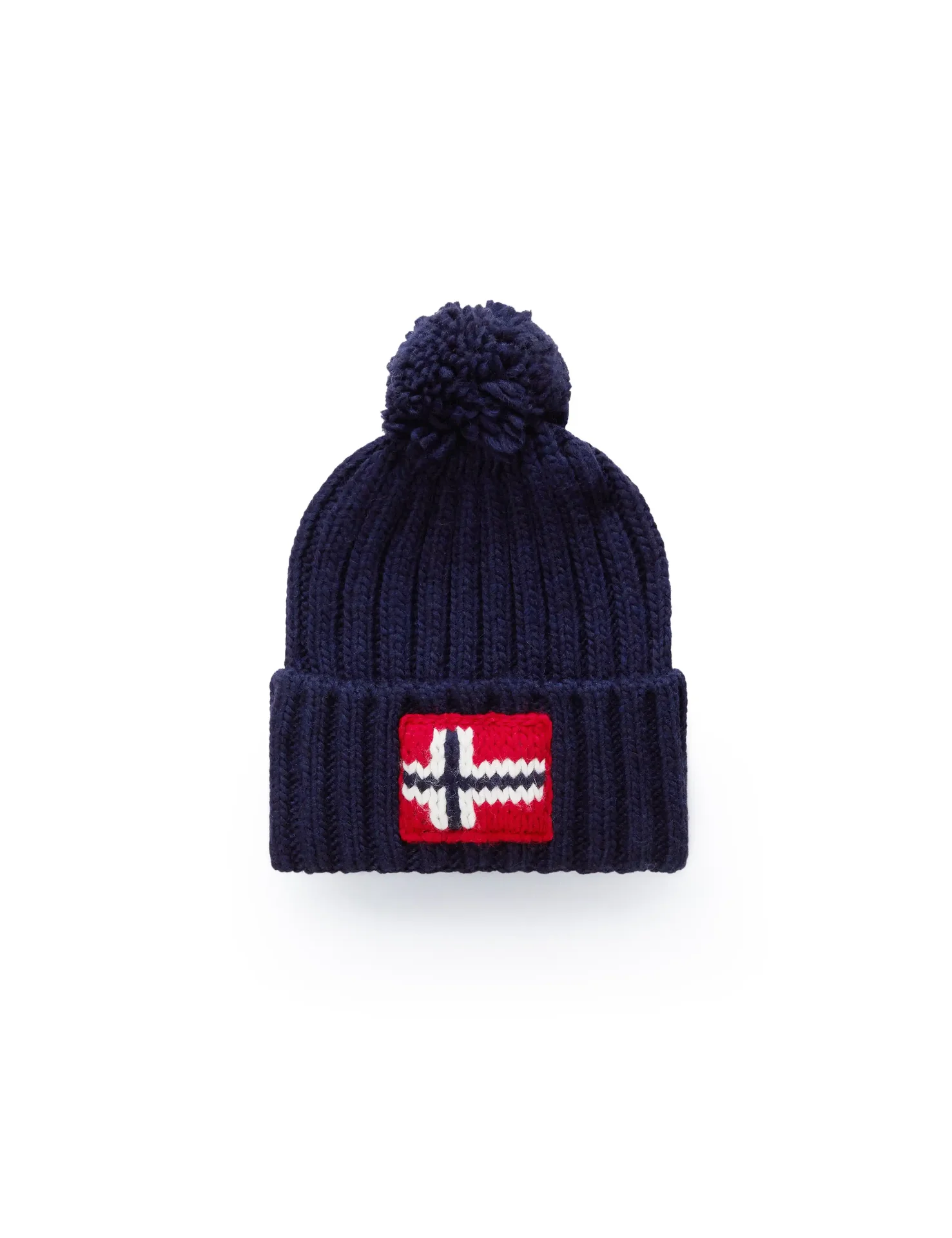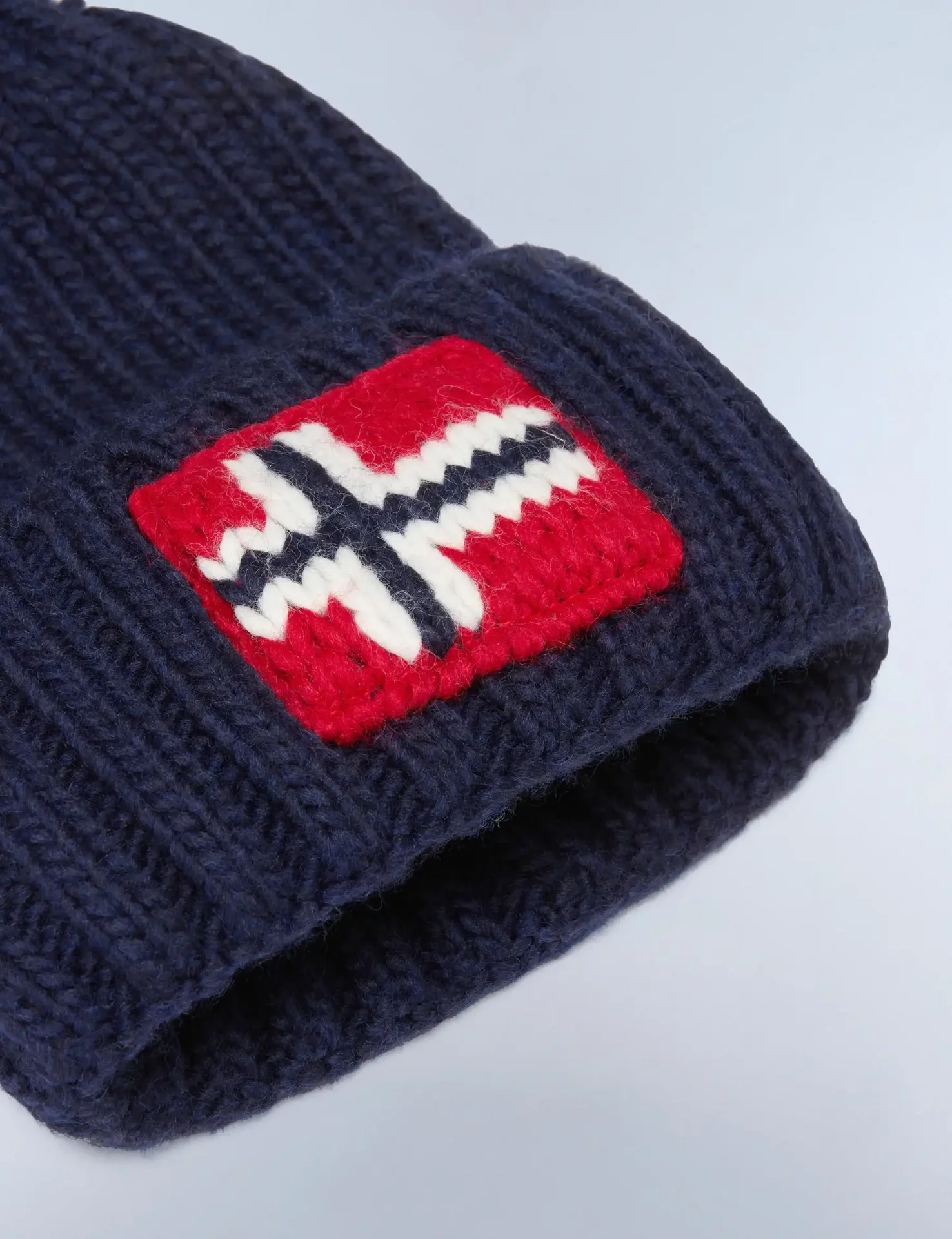 Keep toasty warm this winter with the help of the NAPAPIJRI SEMIURY knitted beanie.  A soft chunky rib knitted bobble hat with the large Norwegian flag embroidered to the front.