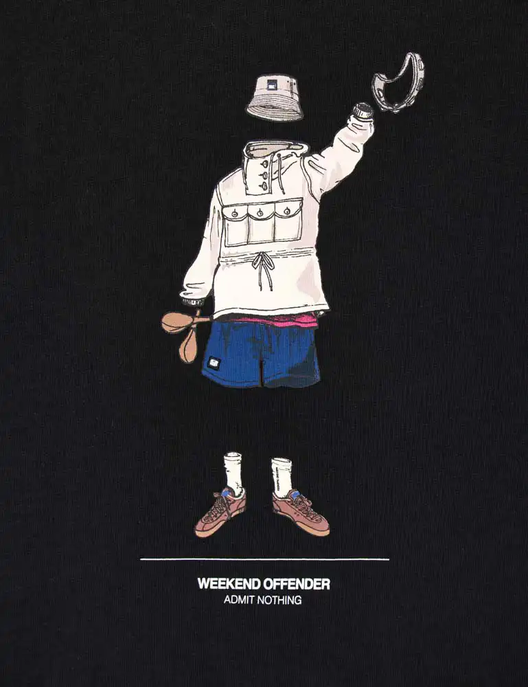 Made from 100% cotton, this crew neck T-Shirt has a printed graphic of a character decked in full Weekend Offender gear to the front of the t-shirt.