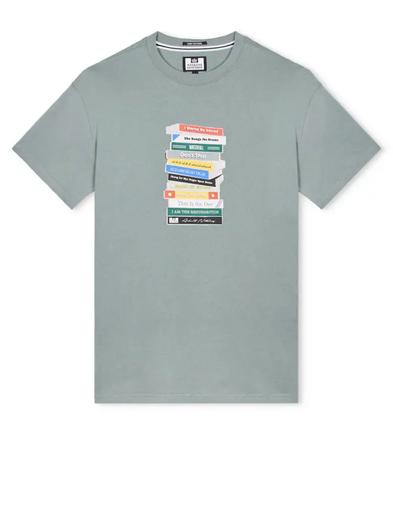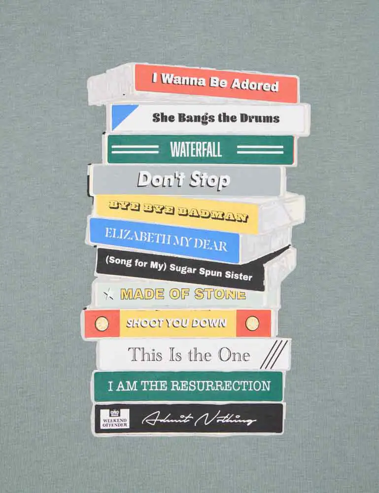 The Weekend Offender Limone graphic t-shirt is crafted from pure cotton and features an illustrated stack of old school casettes each with a song title from the iconic Stone Roses debut album.