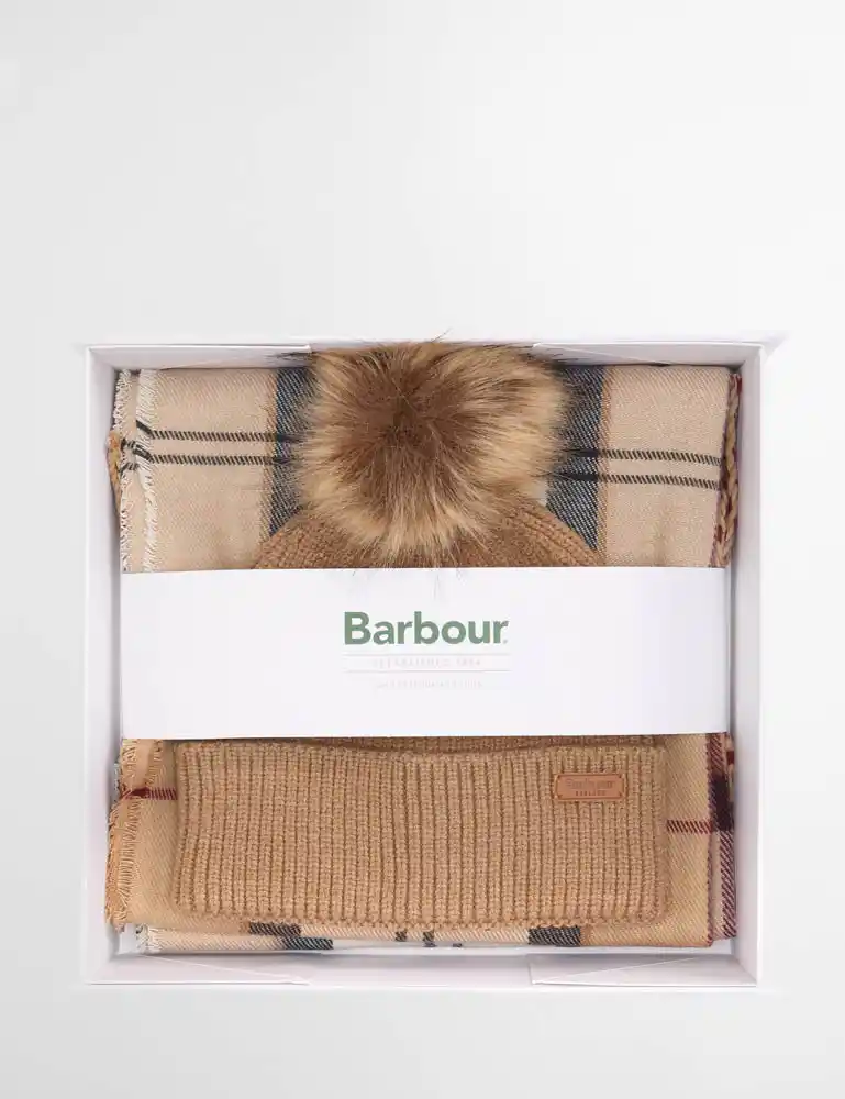 Barbour Dover Beanie Hat and Hailes Scarf Gift Set | Beige