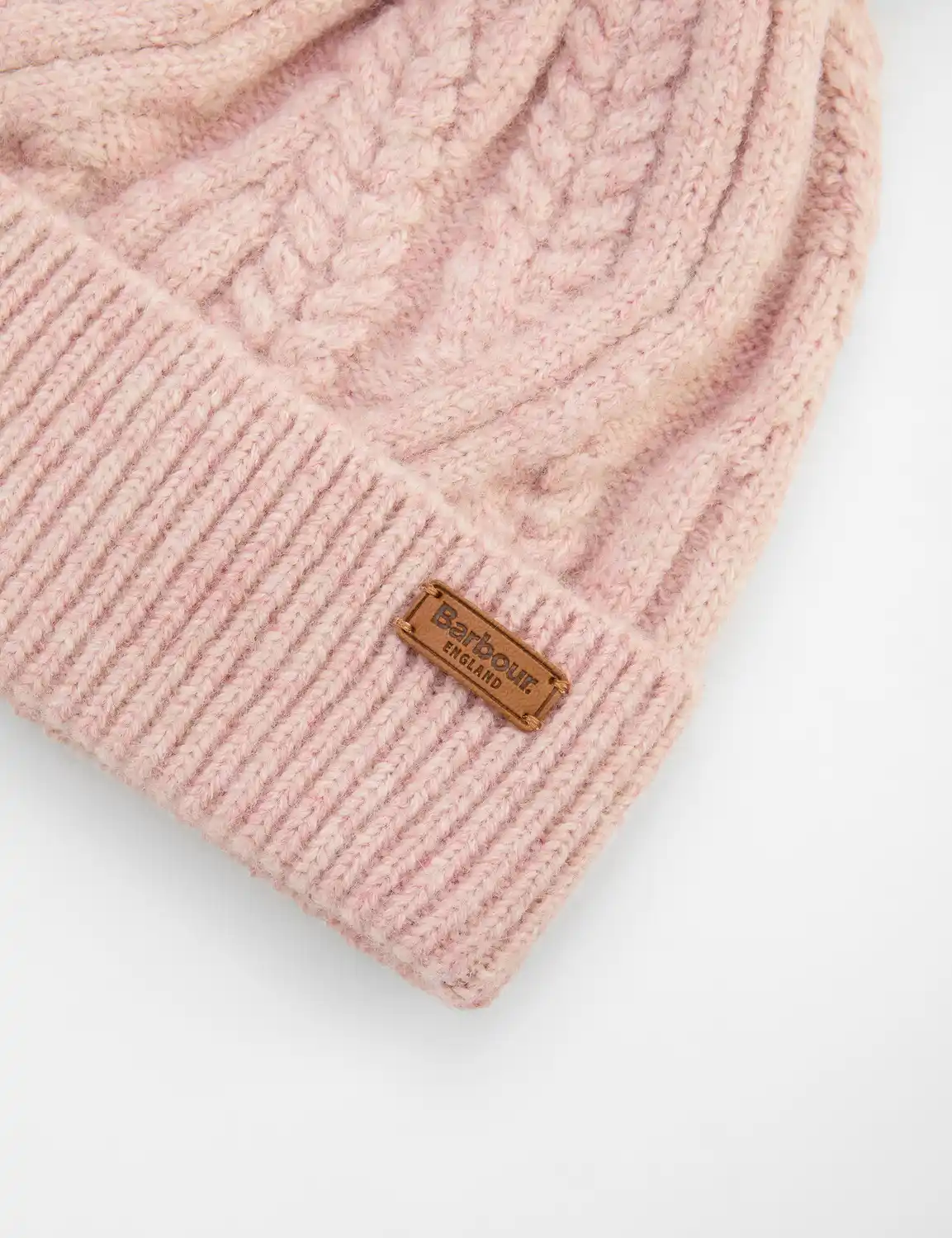 A winter essential from the Barbour womens collection.  Crafted in a chunky cable knit with a turnback hem to provide ultimate warmth. The Barbour logo patch branding and the faux fur pom-pom add the finishing touches.