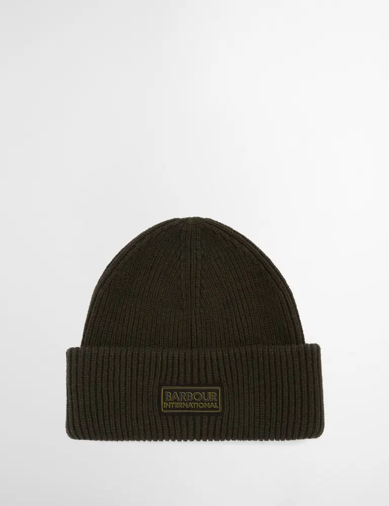 A winter staple from Barbour International's collection of accessories.  A chunky rib knitted beanie with a turn back edge adorned with the International lozenge badge.