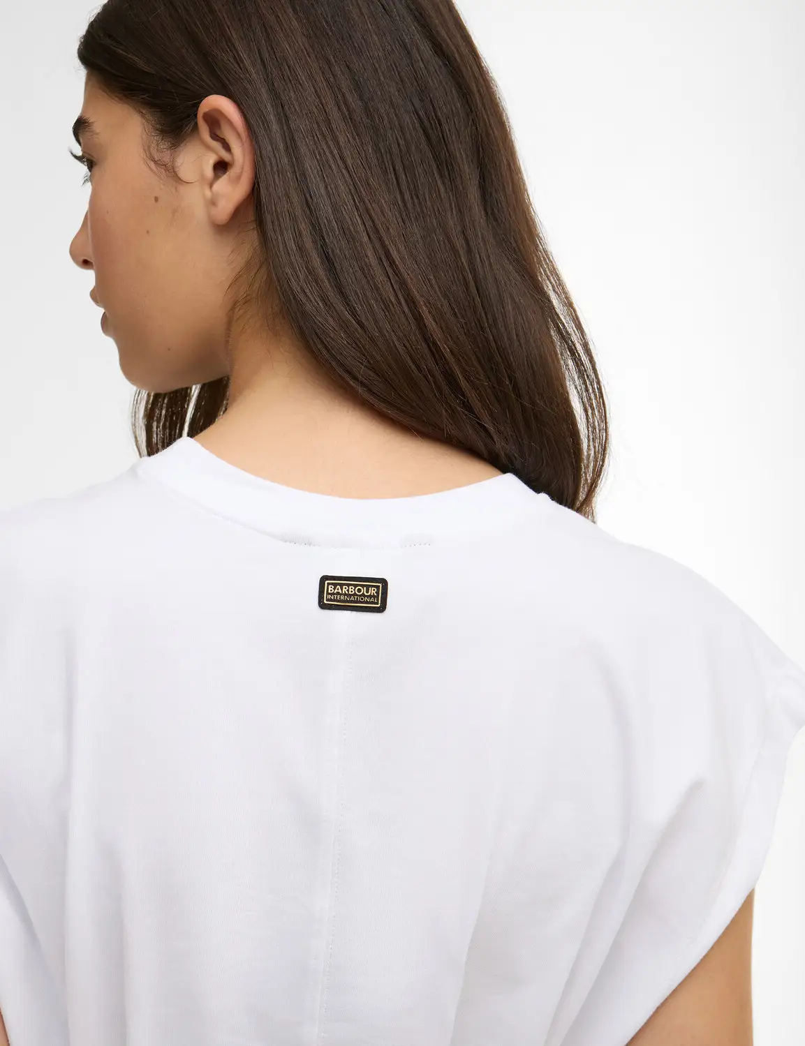 The Barbour International Alexis top, an effortlessly stylish piece that is crafted in soft jersey cotton and styled in a relaxed fit. A self fabric belt and a Barbour Intl branded buckle brings in the sides to make for a more flattering silhouette.