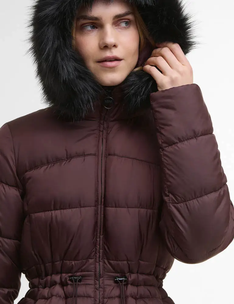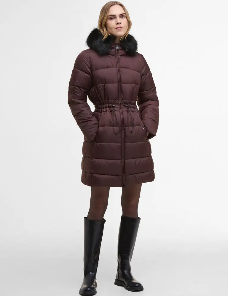 Protect yourself in style this Winter with the help of the Anastasia Puffer Jacket from Barbour Intl. A Mid-thigh length quilted jacket using a lightweight mid-sheen fabric that is adjustable at the waist for a flattering fit. Baffle quilted thorughout for ultimate warmth, the jacket has a fixed hood with removable faux fur trim, two front studded pockets and the signature branding to the arm.