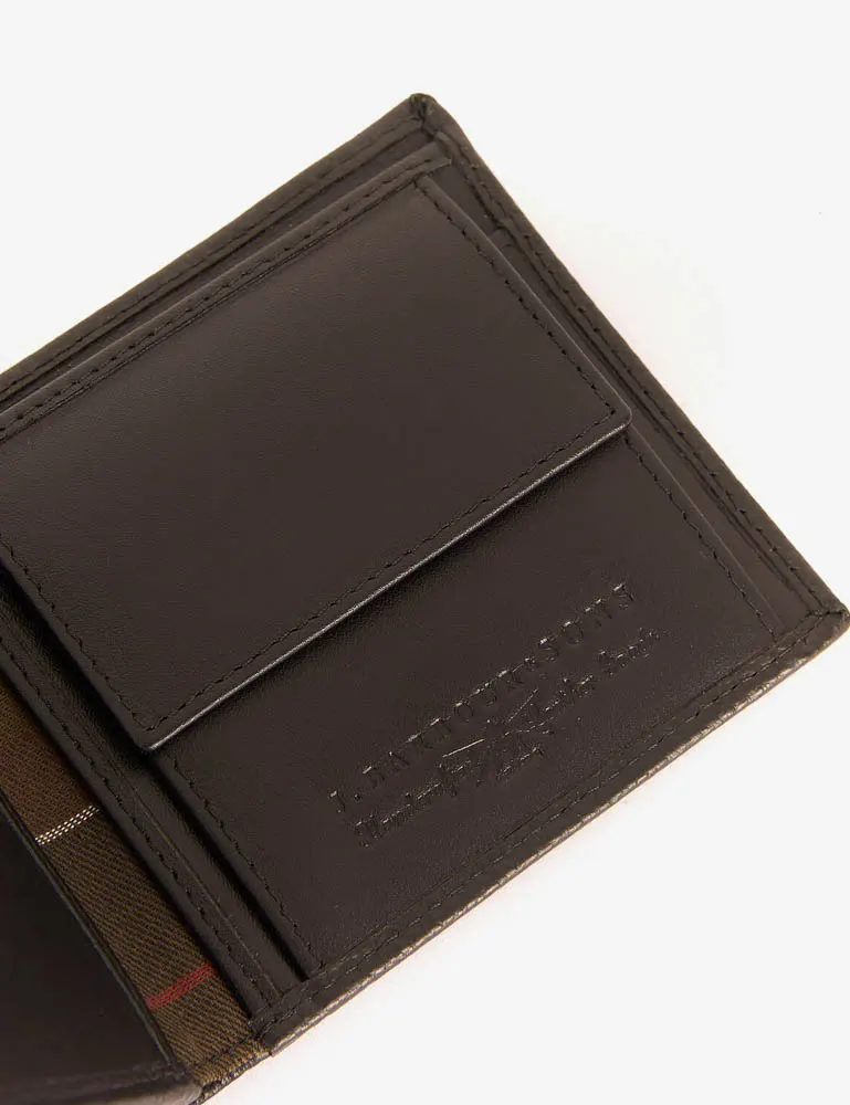 A beautifully crafted bifold wallet from British brand Barbour.  This wallet has been crafted in a soft grain leather outer that has internal card slots to one side and a coin pocket on the other.  A raised Barbour logo to the front and internal tartan highlights add the branding touches to this classic style.