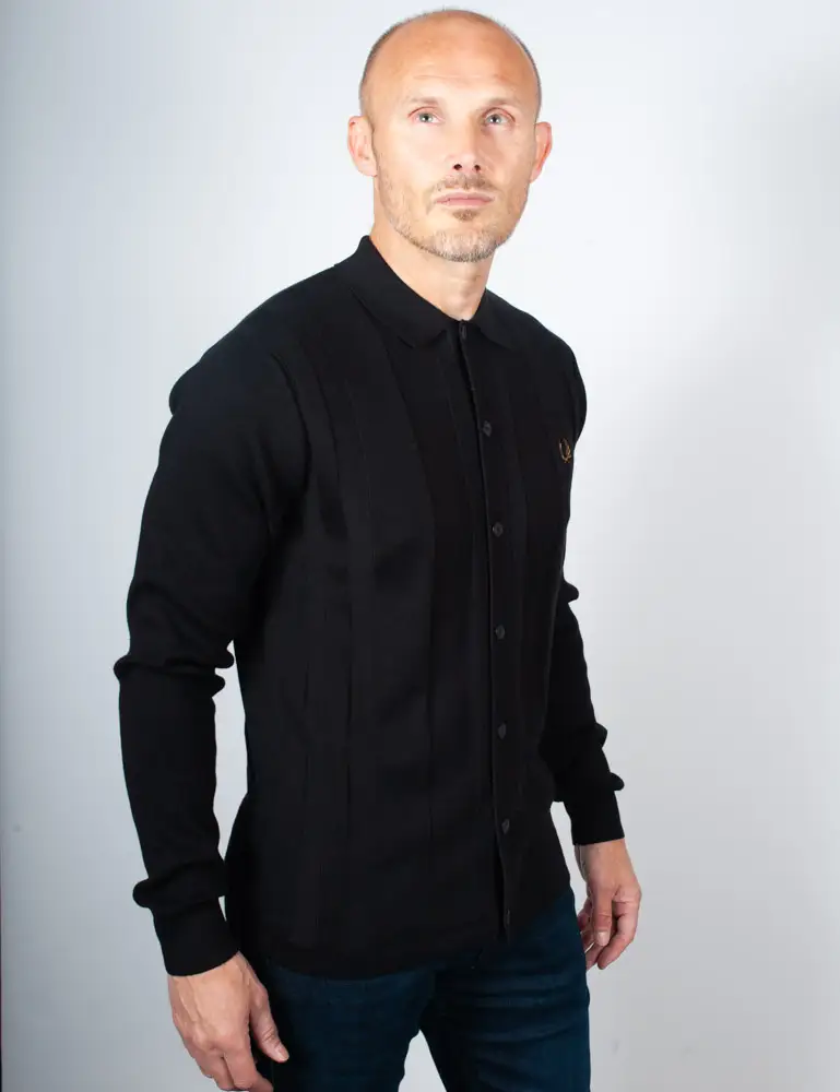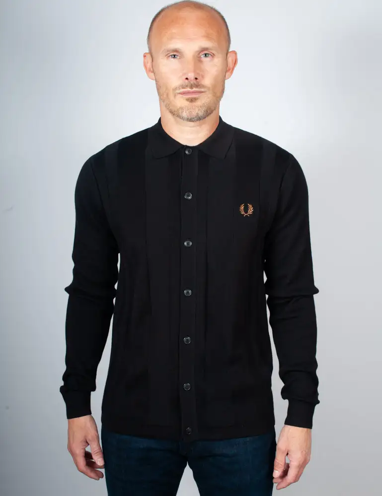 A stunning knitted shirt from British brand Fred Perry.  Minimal in style with a beautiful panelled stripe design and flat knit collar.