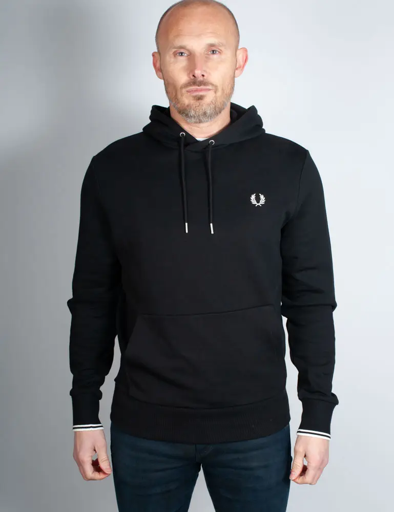 A sporty cotton loopback hooded sweatshirt is a perfect everyday item. It features contrasting tipping on the cuffs, toggle cord adjusters on the hood opening and complete with a matching coloured laurel wreath embroidered on the chest.