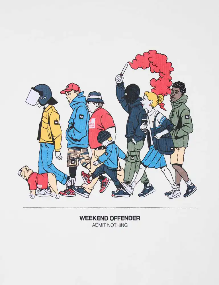 Made from 100% cotton, this crew neck T-Shirt has an illustrated printed graphic showing the diversity of todays modern subculture. All walks of people wearing Weekend Offender gear.